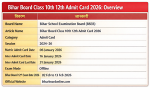 बिहार विद्यालय परीक्षा समिति (BSEB) द्वारा Bihar Board Class 10th 12th Admit Card 2026 जारी कर दिया गया है। मैट्रिक और इंटर की वार्षिक परीक्षा 2026 में शामिल होने वाले छात्रों के लिए यह बड़ी अपडेट है।
